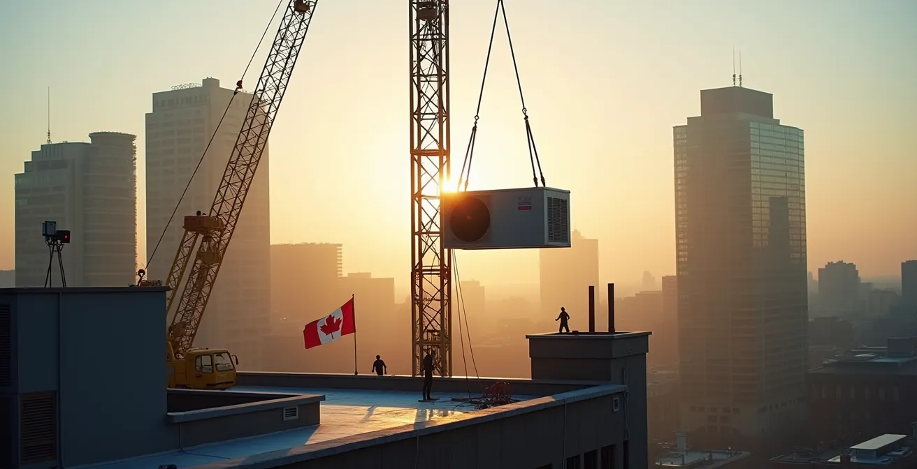 En tant que gestionnaire d’immeuble au cœur de Montréal, vous savez que le remplacement d’une unité de toit est inévitable. C’est une opération lourde, coûteuse, et souvent redoutée. On pense immédiatement à la complexité technique, au choix du bon équipement et à la négociation avec les fournisseurs. On se concentre sur l’unité CVAC, en oubliant que dans l’environnement urbain dense de Montréal, le véritable défi est ailleurs. Le projet ne dérape que rarement à cause d’un problème mécanique ; il implose à cause d’un permis de rue qui arrive trop tard, d’une grue bloquée par une voiture mal remorquée ou d’un adaptateur de base mal conçu qui provoque une infiltration d’eau six mois plus tard.